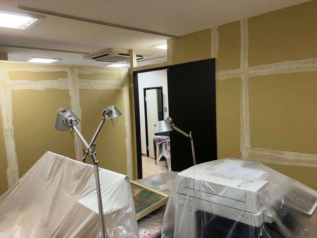 結構広くスペースの有効活用のため一部壁も作り、現在は壁紙を張るための養生作業をしております。
